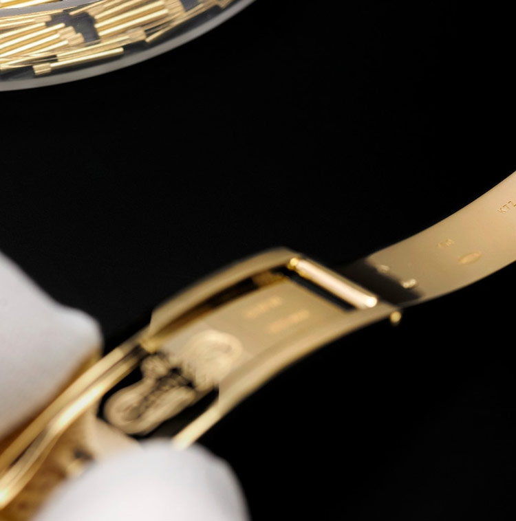 1.金屬表帶。手表展開時,表帶折扣上的字母或標志應與表盤一致。如果是顛倒的,說明表帶裝反了。可以用拇指打開手表按鈕,蝶形按鈕只能看logo和表盤是否一致。表帶是上下顛倒的,戴起來一定很別扭。